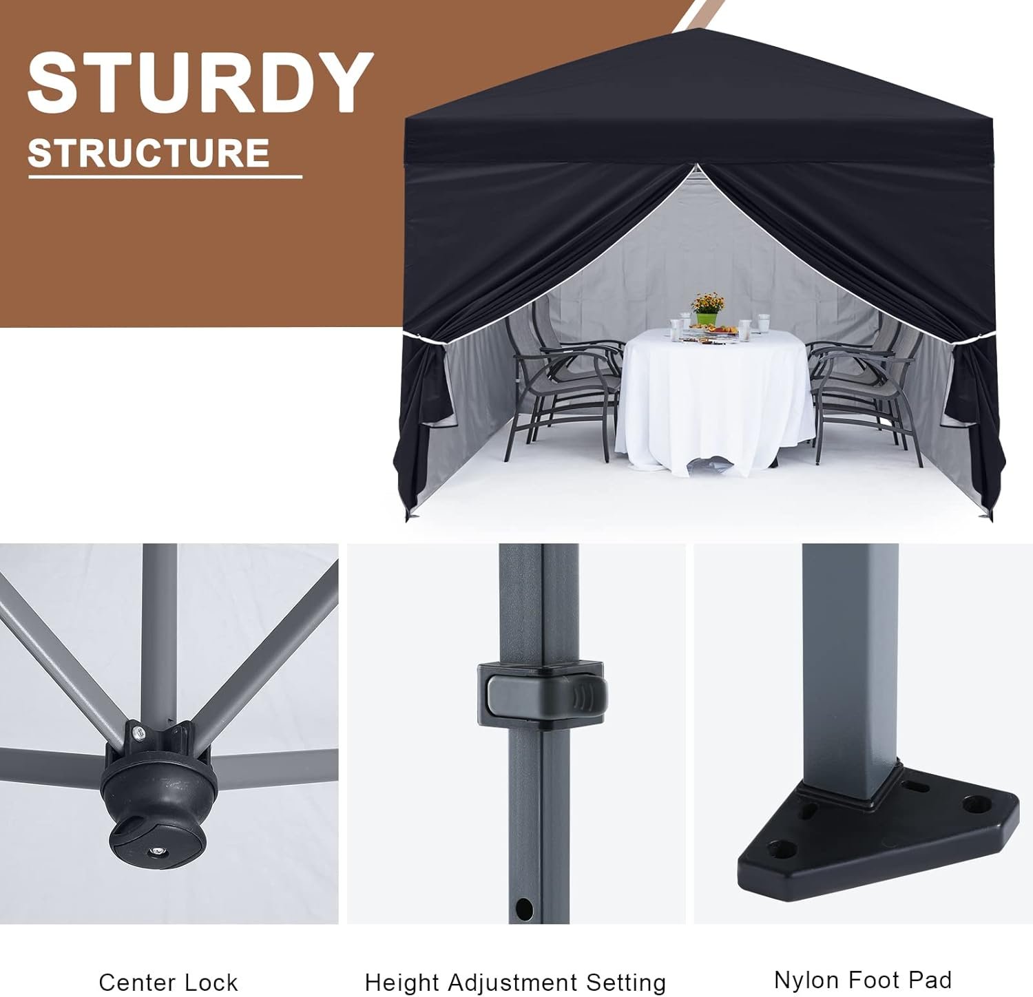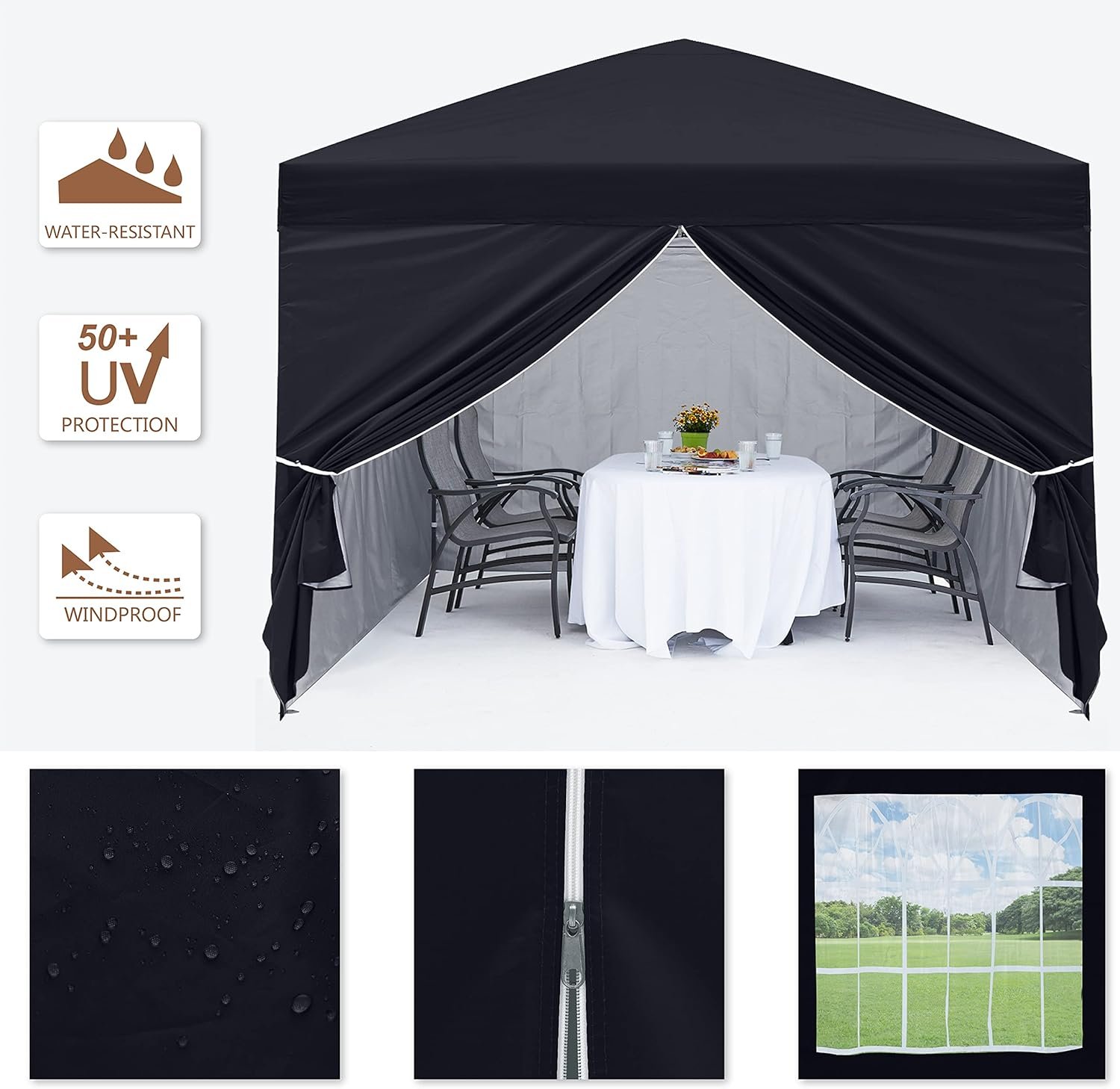 • Excellent Design: (1) The canopy has 4 removable sidewalls, 1 doorwall has a smooth running zipper- it’s very convenient for you to come in and go out; 2 sidewalls are equipped with elegant and attractive church windows, which are made of super transparent PVC, allow enough light through and guarantee you a clear view. (2) The convenient pop up design makes it much easier to set up the canopy, with no tools required. It can also be easily put away and transported.